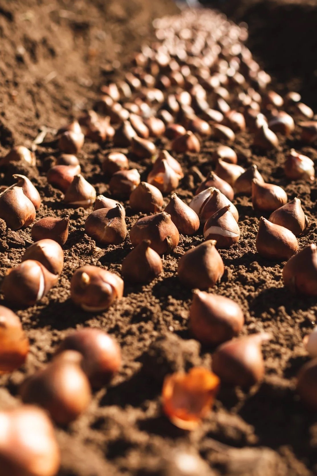 Space the bulbs according to your preference as tulip bulbs can be nearly touching each other on the sides or be feet apart. Our preference is to plant them thick for a nice display, so we shoot for 25-30 bulbs/sq. ft.